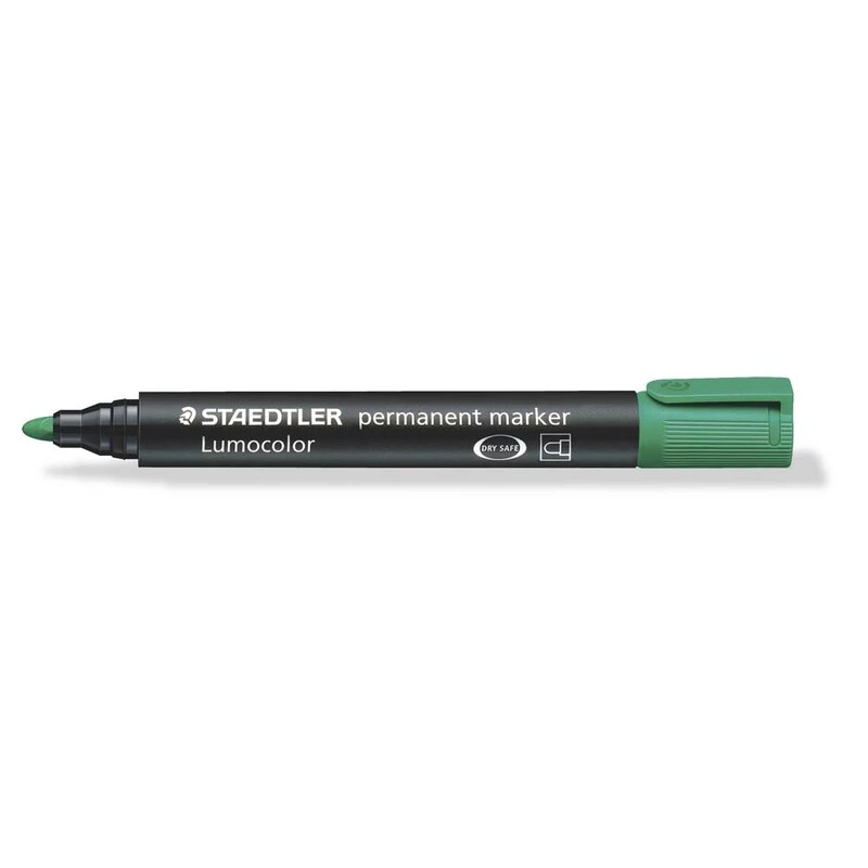 Permanent marker (stift) met een 2 mm ronde punt, in kleur groen. Merk: Staedtler.